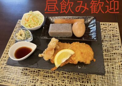 揚げ物.おでん(3種類).小鉢.サラダ.ご飯.お漬物.味噌汁付き